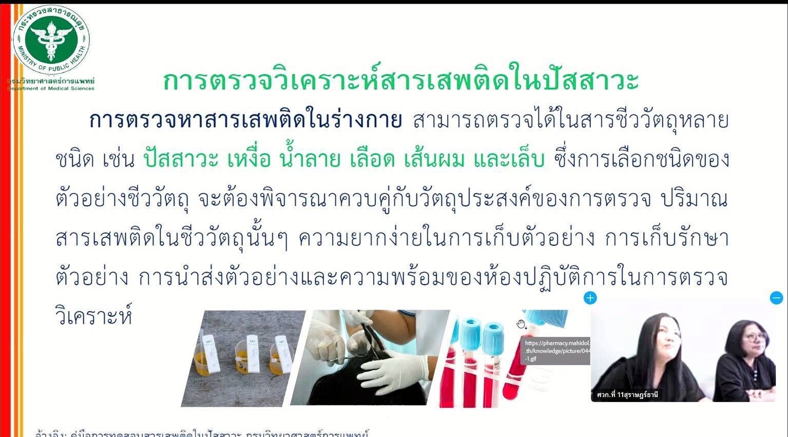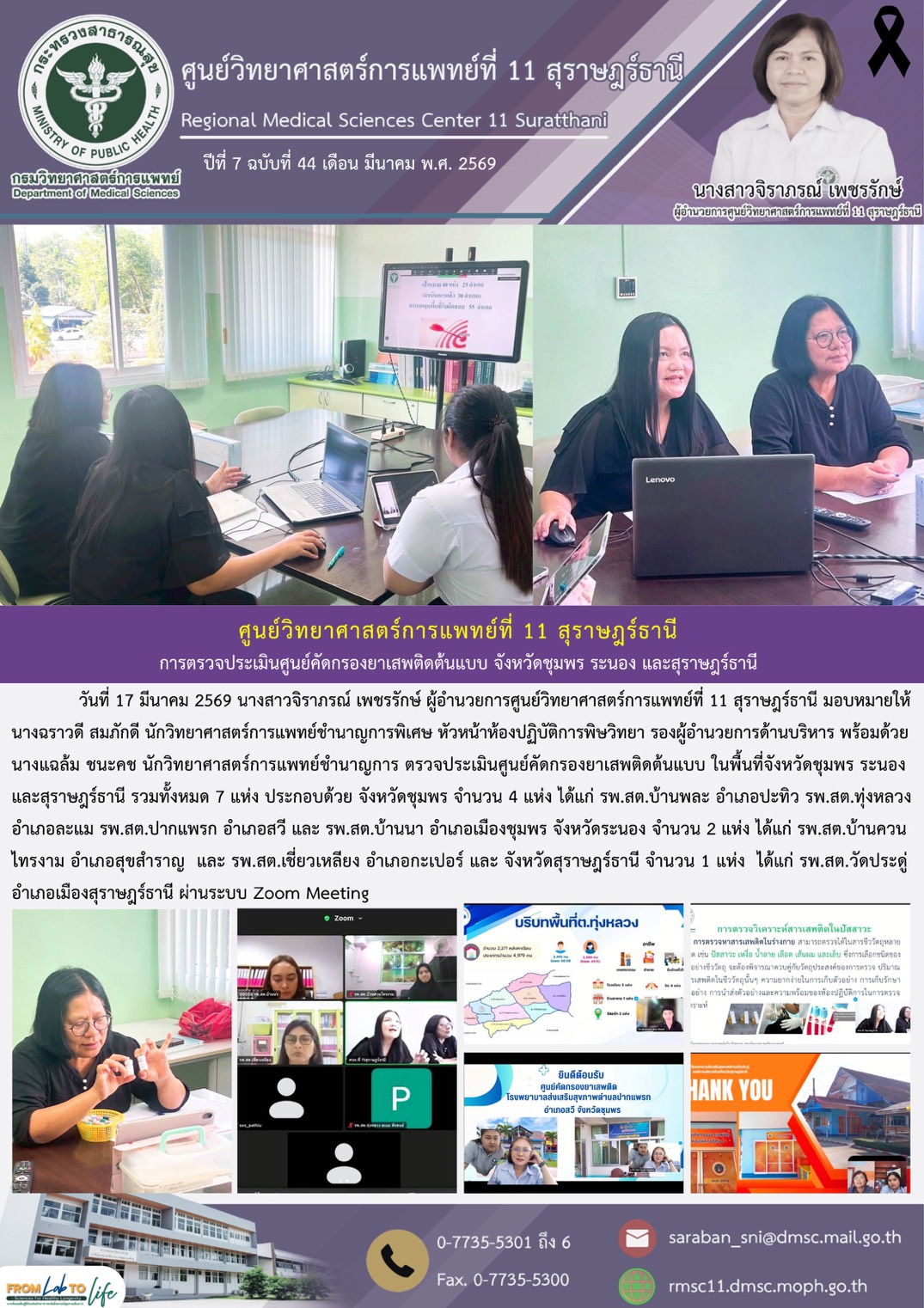 วันที่ 17 มีนาคม 2569 นางสาวจิราภรณ์ เพชรรักษ์ ผู้อำนวยการศูนย์วิทยาศาสตร์การแพทย์ที่ 11 สุราษฎร์ธานี มอบหมายให้ นางฉราวดี สมภักดี นักวิทยาศาสตร์การแพทย์ชำนาญการพิเศษ หัวหน้าห้องปฏิบัติการพิษวิทยา รองผู้อำนวยการด้านบริหาร และนางแฉล้ม ชนะคช นักวิทยาศาสตร์การแพทย์ชำนาญการ ตรวจประเมินศูนย์คัดกรองยาเสพติดต้นแบบ ในพื้นที่จังหวัดชุมพร ระนอง และสุราษฎร์ธานี รวมทั้งหมด 7 แห่ง ประกอบด้วย จังหวัดชุมพร จำนวน 4 แห่ง ได้แก่ รพ.สต.บ้านพละ อำเภอปะทิว รพ.สต.ทุ่งหลวง อำเภอละแม รพ.สต.ปากแพรก อำเภอสวี และ รพ.สต.บ้านนา อำเภอเมืองชุมพร จังหวัดระนอง จำนวน 2 แห่ง ได้แก่  รพ.สต.บ้านควนไทรงาม อำเภอสุขสำราญ  และ รพ.สต.เชี่ยวเหลียง อำเภอกะเปอร์ และ จังหวัดสุราษฎร์ธานี จำนวน 1 แห่ง  ได้แก่ รพ.สต.วัดประดู่  อำเภอเมืองสุราษฎร์ธานี ผ่านระบบ Zoom Meeting