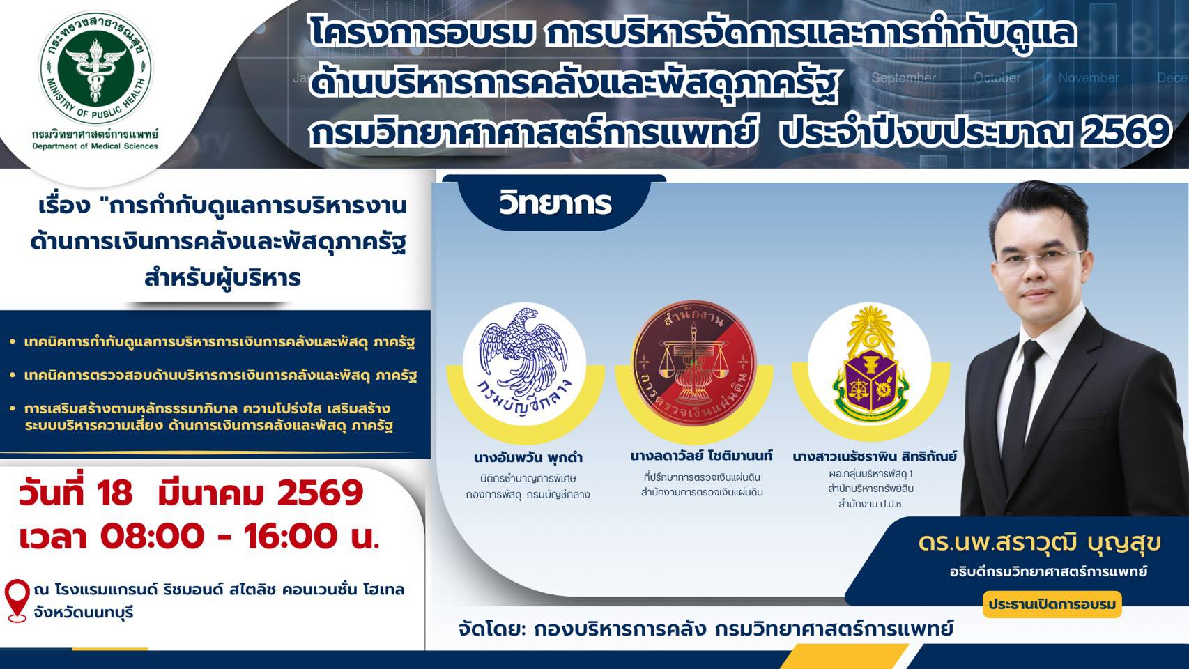 วันที่ 18 มีนาคม 2569 ดร.นพ.สราวุฒิ บุญสุข อธิบดีกรมวิทยาศาสตร์การแพทย์ เป็นประธานเปิดโครงการอบรมการบริหารจัดการและการกำกับดูแลด้านบริหารการคลังและพัสดุภาครัฐ กรมวิทยาศาสตร์การแพทย์ เรื่อง "การกำกับดูแลบริหารงานด้านการเงินการคลังและพัสดุภาครัฐ สำหรับผู้บริหาร" กล่าวรายงานโดย นพ.พิเชฐ บัญญัติ รองอธิบดีกรมวิทยาศาสตร์การแพทย์ โดยมี ดร.นพ.สุรเดชช ชวะเดช รองอธิบดีกรมวิทยาศาสตร์การแพทย์ พร้อมด้วย นางสาวจิราภรณ์ เพชรรักษ์ ผู้อำนวยการศูนย์วิทยาศาสตร์การแพทย์ที่ 11 สุราษฎร์ธานี ผู้บริหารส่วนกลางและศูนย์วิทยาศาสตร์การแพทย์ รวมทั้ง ข้าราชการ และเจ้าหน้าที่กรมวิทยาศาสตร์การแพทย์ เข้าร่วมโครงการ จัดโดย กองบริหารการคลัง กรมวิทยาศาสตร์การแพทย์ ณ โรงแรมแกรนด์ริชมอนด์ สไตลิช คอนเวนชั่น โฮเทล จังหวัดนนทบุรี