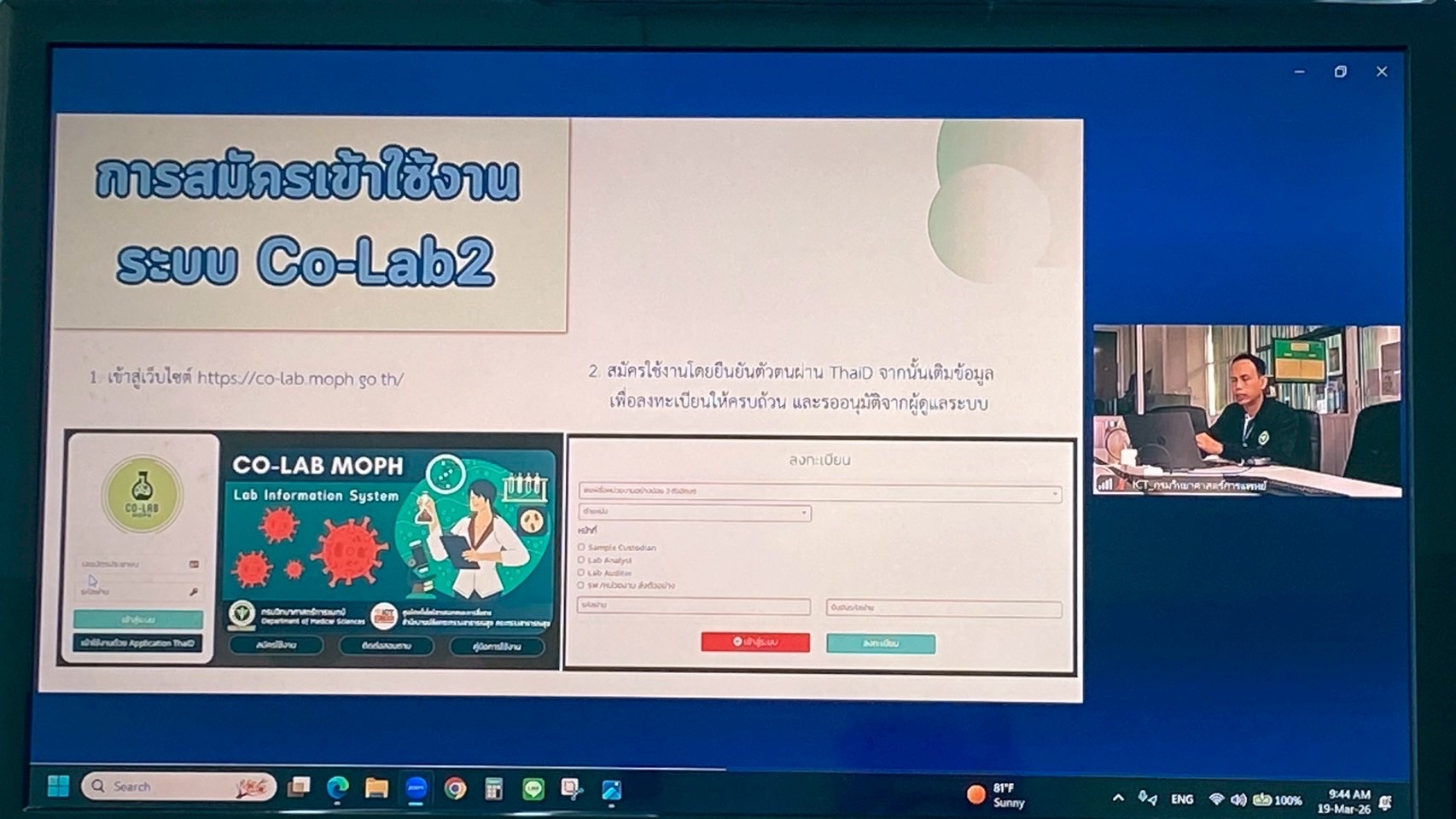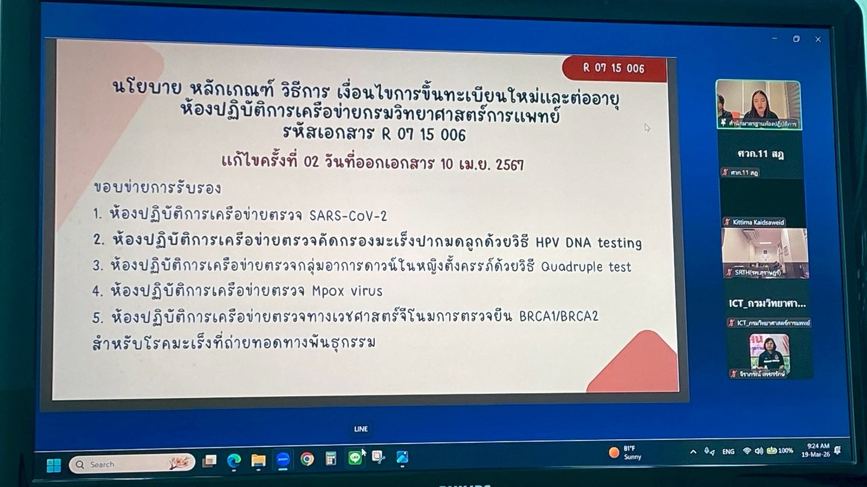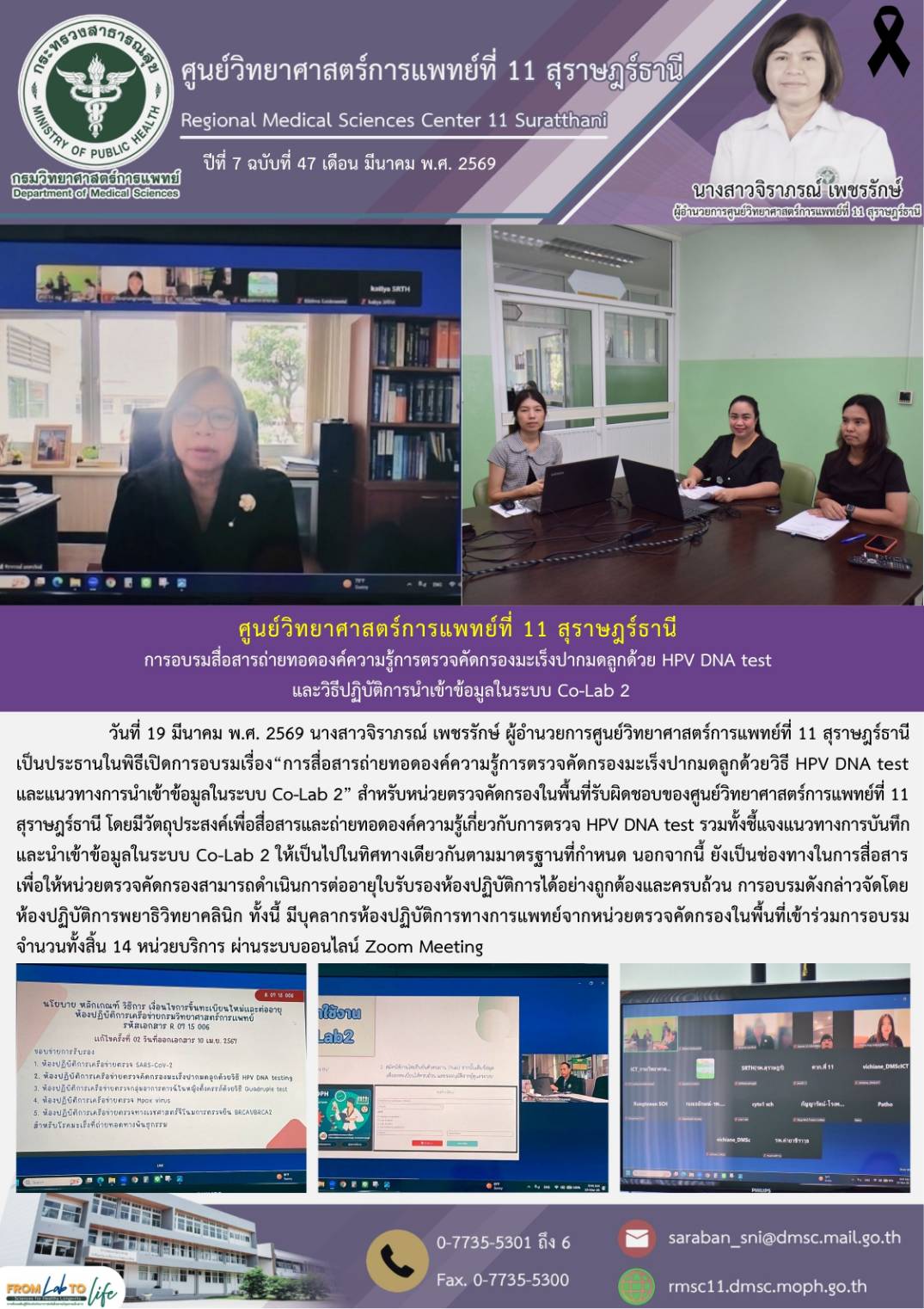 วันที่ 19 มีนาคม พ.ศ. 2569 นางสาวจิราภรณ์ เพชรรักษ์ ผู้อำนวยการศูนย์วิทยาศาสตร์การแพทย์ที่ 11 สุราษฎร์ธานี เป็นประธานในพิธีเปิดการอบรมเรื่อง“การสื่อสารถ่ายทอดองค์ความรู้การตรวจคัดกรองมะเร็งปากมดลูกด้วยวิธี HPV DNA test และแนวทางการนำเข้าข้อมูลในระบบ Co-Lab 2” สำหรับหน่วยตรวจคัดกรองในพื้นที่รับผิดชอบของศูนย์วิทยาศาสตร์การแพทย์ที่ 11 สุราษฎร์ธานี โดยมีวัตถุประสงค์เพื่อสื่อสารและถ่ายทอดองค์ความรู้เกี่ยวกับการตรวจ HPV DNA test รวมทั้งชี้แจงแนวทางการบันทึกและนำเข้าข้อมูลในระบบ Co-Lab 2 ให้เป็นไปในทิศทางเดียวกันตามมาตรฐานที่กำหนด นอกจากนี้ ยังเป็นช่องทางในการสื่อสารเพื่อให้หน่วยตรวจคัดกรองสามารถดำเนินการต่ออายุใบรับรองห้องปฏิบัติการได้อย่างถูกต้องและครบถ้วน การอบรมดังกล่าวจัดโดยห้องปฏิบัติการพยาธิวิทยาคลินิก ทั้งนี้ มีบุคลากรห้องปฏิบัติการทางการแพทย์จากหน่วยตรวจคัดกรองในพื้นที่เข้าร่วมการอบรม จำนวนทั้งสิ้น 14 หน่วยบริการ ผ่านระบบออนไลน์ Zoom Meeting